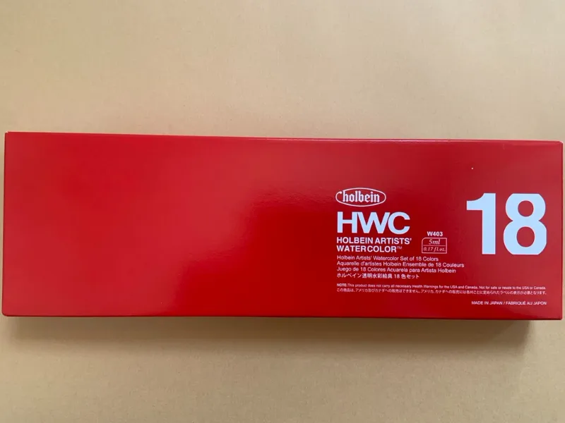 ホルベインのHWC透明水彩は多くのセットがありますが、我が家はバランスの良いHWC18色のセットを購入しました。